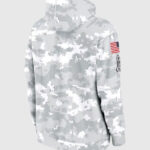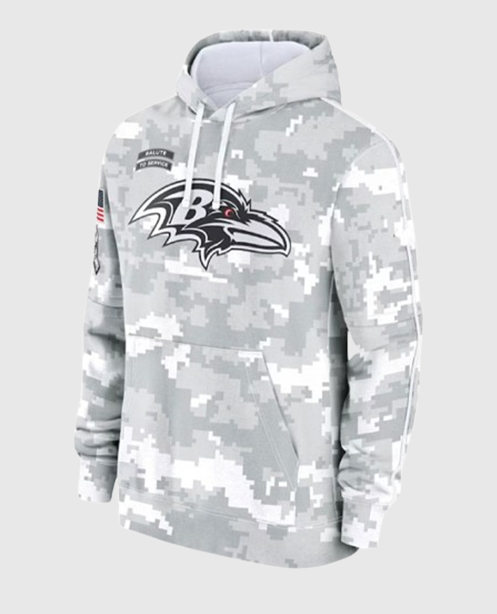 The Baltimore Ravens salute to service hoodie is the team pride and tribute to football team Baltimore Ravens. Crafted from premium fleece fabric while offering a stylish design with Arctic camo print. It features a pullover style, hooded collar, and rib-knitted cuffs for a snug fit. The pouch pocket adds convenience, making it ideal for casual wear. Designed in a grey camo pattern, this hoodie is a must-have for Ravens fans who want to show their support with a bold and meaningful look.