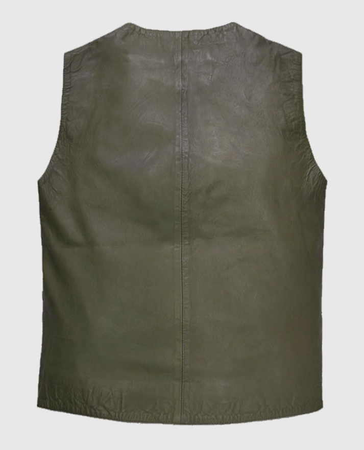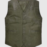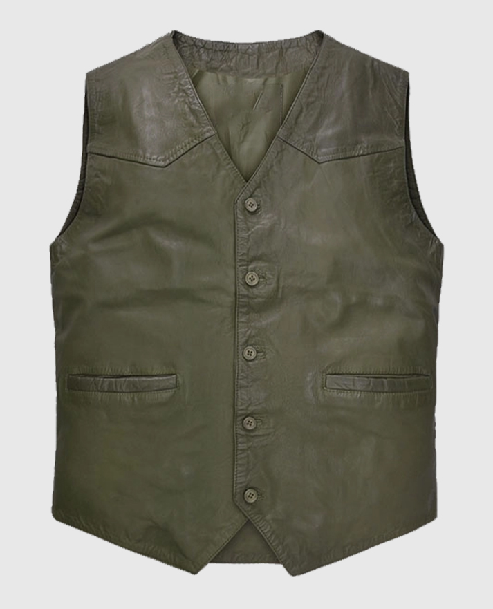Elevate your wardrobe with this cowboy leather vest made from premium sheepskin leather for a rugged yet refined look. It features a button front closure and a classic V-neckline. The unique green-washed and wax finish adds a rustic, weathered appeal, making it a standout piece for any casual or Western-inspired outfit. Whether layering it over a plaid shirt or a simple tee, this vest brings a touch of cowboy authenticity to your style and takes your look to the next level.