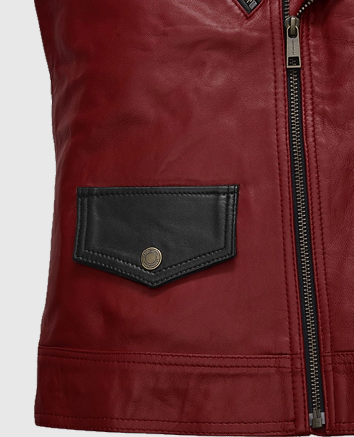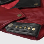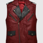 Embrace Thor’s bold, heroic style with this cherry red leather vest, inspired by the blockbuster film Thor: Love and Thunder. Crafted from premium sheepskin leather, it features an asymmetrical zipper closure and a notch lapel collar for a striking biker-inspired look. The cherry red color with contrasting black lapels and metallic gold stud embellishments creates a battle-ready aesthetic, while the quilted detailing on the shoulders adds rugged texture. Perfect for channeling your inner god of thunder or making a bold fashion statement.