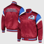 The Colorado Avalanche Jacket is a stylish tribute to the legendary NHL ice hockey team Colorado Avalanche. Perfect for die-hard fans and sports enthusiasts. Expertly crafted from premium satin with sleek and smooth finish, while the soft viscose lining ensures all-day comfort. The full snap-tab button closure and rib-woven collar, cuffs, and hemline give it a classic varsity look. It features two outer and two inner pockets for maximum storage. This burgundy mitchell and ness avalanche jacket is a must-have for every ice hockey fan.