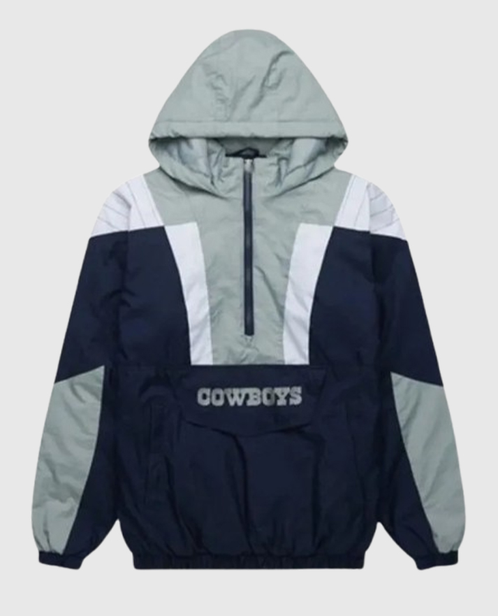 Show your team spirit with this Dallas Cowboys Starter Jacket, a perfect blend of style and functionality. Crafted from a durable cotton-polyester fabric, this jacket offers comfort and a lightweight feel. The half-zipper pullover closure adds a sporty edge, while the hooded collar provides extra warmth and protection against the elements. Designed with full-length sleeves and elastic cuffs and hemline, it ensures a snug and secure fit. The pouch pocket adds practicality, making it ideal for carrying essentials. Featuring a bold multicolor design with signature Cowboys branding, this jacket is a must-have for football fan.