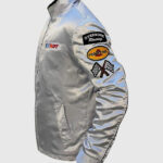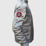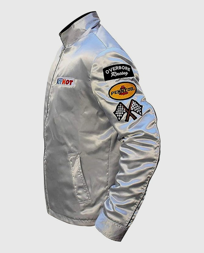 Make a bold style statement with the Death Proof Silver Jacket, inspired by the iconic character Stuntman Mike from the 2007 cult classic movie Death Proof. This standout piece captures the essence of vintage racing fashion with a modern twist. Crafted from sleek satin fabric and lined with soft viscose, it’s designed for both comfort and flair. The shirt-style collar and front zipper closure give it a sharp, classic look, while the long sleeves with button cuffs enhance its tailored fit. What truly sets this jacket apart are the eye-catching racing patches on the sleeve and chest, adding an edgy, rebellious vibe.