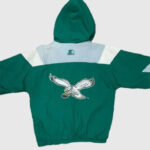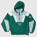 This green and white unisex jacket is a nostalgic throwback to the classic sports fashion of the 1990s, inspired by the Philadelphia Eagles. Made from a durable cotton-polyester blend with a soft viscose lining and features a half-zip front, a hooded collar, and elastic cuffs for a relaxed fit. While a pouch pocket adds practicality. Ideal for game days, casual outings, or layering in colder weather. Buy 90s starter jackets now and pairs it with joggers and sneakers or denim and boots.
