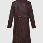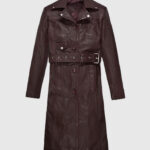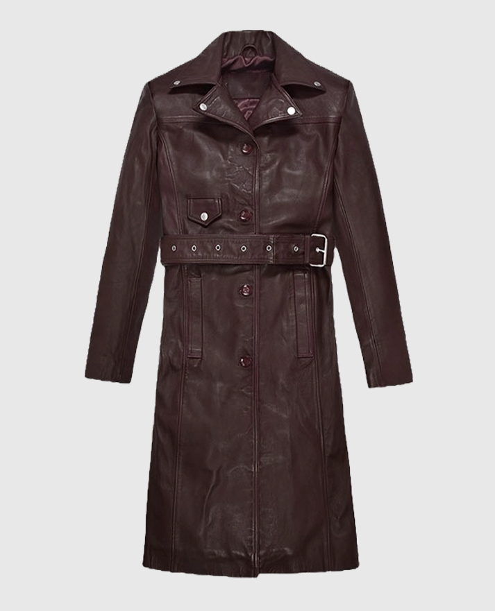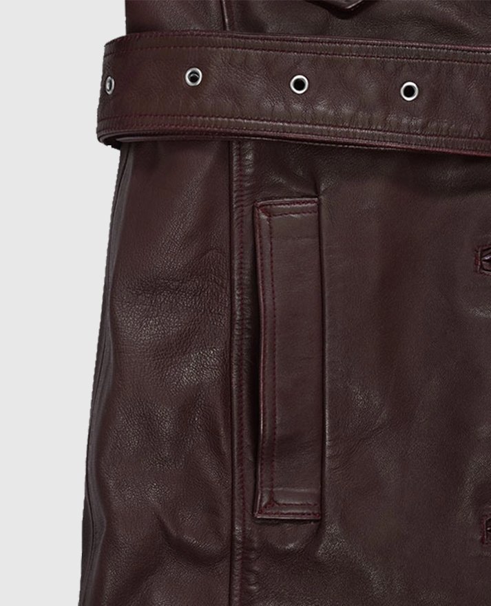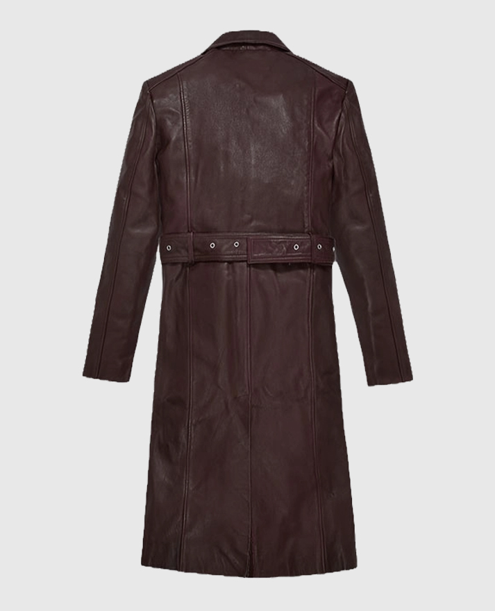 Take your style to the next level with a timeless trench coat, a perfect blend of classic sophistication and modern style. Inspired by the stunning Mexican actress Eiza Gonzalez, she was spotted while fetching coffee. Crafted from real sheepskin leather in a rich burgundy hue, this coat features a button closure and a notch lapel collar, offering a refined look. The full-length sleeves with round cuffs and pockets add both functionality and charm. So, elevate your wardrobe with this chic trench coat and be the center of attention.