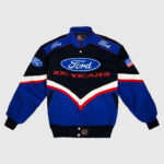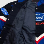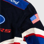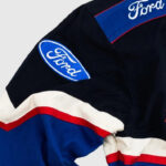 The Ford racing jacket is a must-have for motorsport enthusiasts and inspired by the vibrant style of racing culture. Made from high-quality real leather and features a stand-up collar, snap-tab closure, and elasticized cuffs with two side waist pockets. The striking blue and black color combination with “Ford” logos makes it ideal for outdoor games and sporting events. Pair it with dark denim and sneakers or layer it over a hoodie for added warmth. Get yours now and embrace speed, performance, and high-octane fashion.