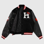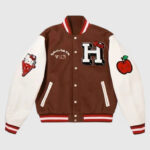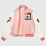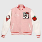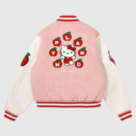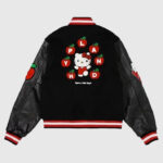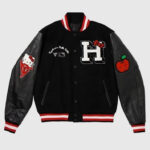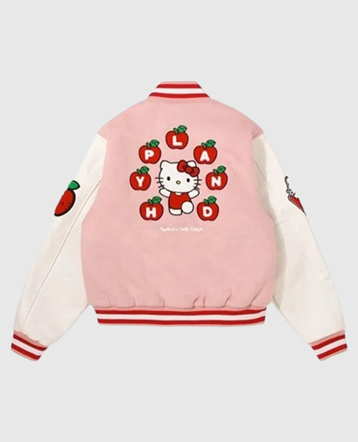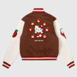 Add a touch of playful charm to your wardrobe with the Hello Kitty Varsity Jacket. We made it from premium wool with leather sleeves and soft viscose lining to enhance comfort for everyday wear. Featuring adorable Hello Kitty-themed patches, a bold varsity “H” emblem, and vibrant red-and-white striped rib-knitted details. The buttoned closure, ribbed cuffs, hemline and collar provide a classic varsity fit, while the multiple pockets add functionality. Available in pink, brown and black color. Whether paired with jeans, skirts, or joggers, this jacket is a trendy go-to for casual outings, college days, or layering in cooler seasons.