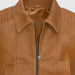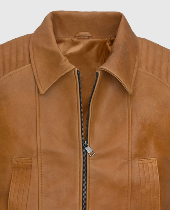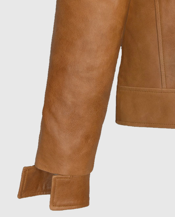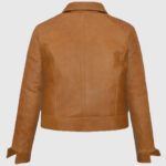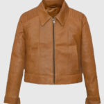 This light brown leather jacket channels Jenna Ortega’s brooding presence as Nicky in the movie Flick Finestkind. Crafted from smooth sheepskin leather and backed with soft viscose lining, it’s tailored for both comfort and character. The structured shirt-style collar, crisp zipper front, and stitched vertical detailing add retro polish to a modern silhouette. Clean cuffs and minimal hardware let the jacket speak in subtle tones. Perfect for coffee days and movie nights with tucked-in tee and high-waisted vintage jeans.