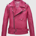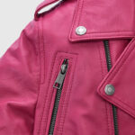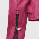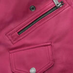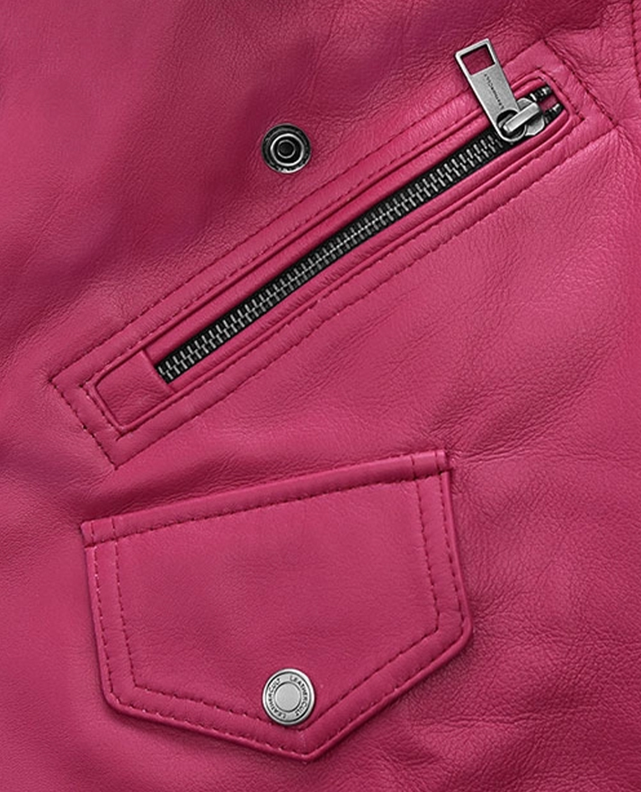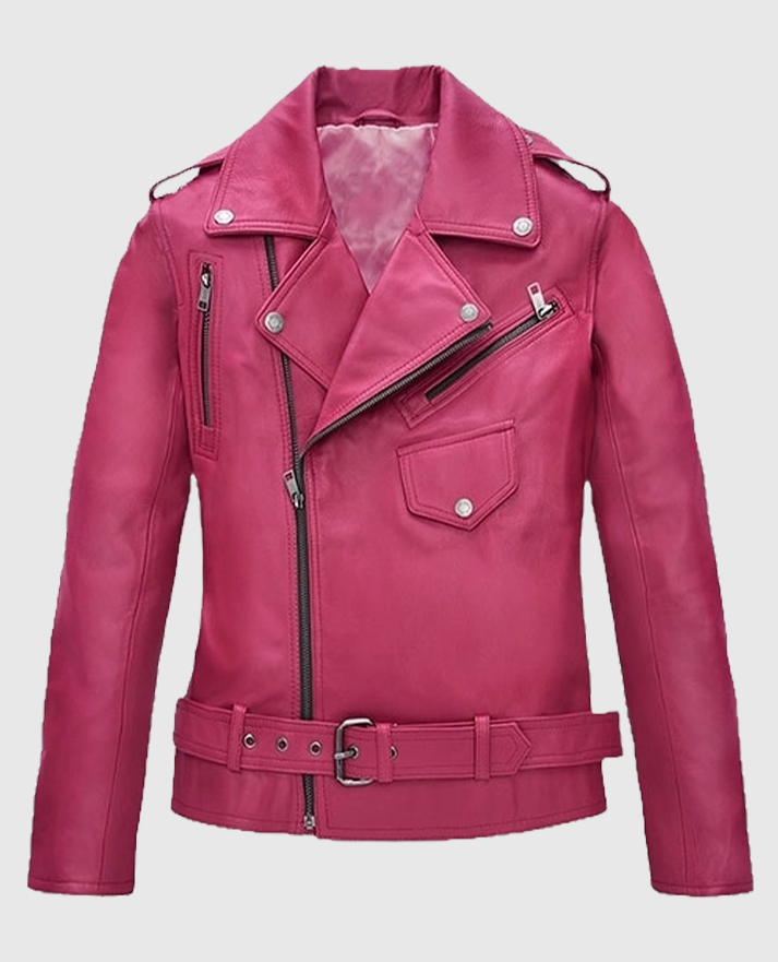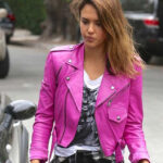 Fierce meets feminine in this unapologetically bold pink leather jacket, inspired by Jessica Alba’s street-style look. Crafted from high-quality sheepskin leather with a soft viscose lining, it delivers a moto attitude with a pop-star punch. The asymmetrical zip closure, notch lapel collar, and belted waist create a classic biker silhouette. Zippered cuffs and silver-tone hardware finish off the look with a polished edge. It’s loud, it’s luxe, and it doesn’t hold back.