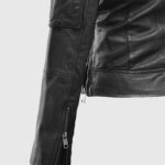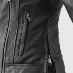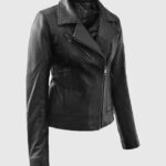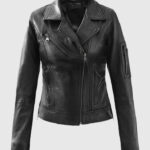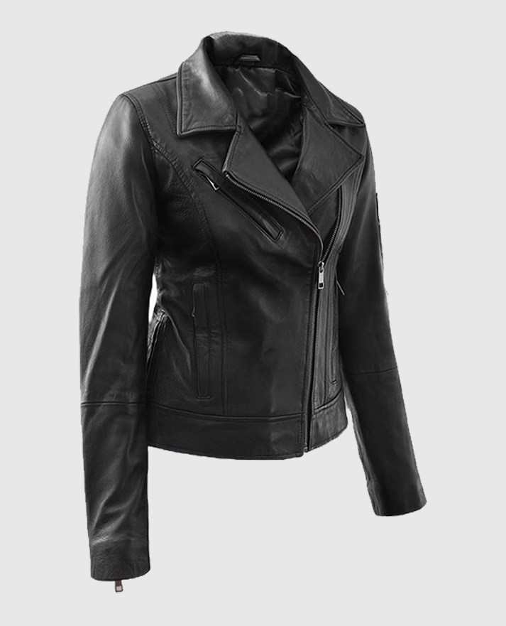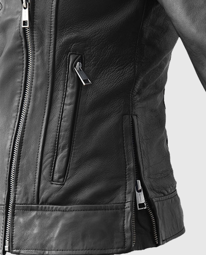 Unleash your inner powerhouse with this Karen Gillan-inspired black leather jacket. She wore it while filming a scene for the British TV series Doctor Who. It is made from supple sheepskin leather and lined with soft viscose. This jacket is designed for all-day comfort with a sharply tailored fit. The asymmetrical zipper front, notch lapel collar, and quilted side panels add visual intrigue, while the three zipper pockets plus an extra sleeve pocket offer utility with an edge. From its contour-hugging cut to the zippered cuffs, every detail screams biker chic. Style it with black skinny jeans and combat boots for a bold street look.