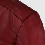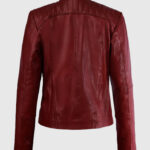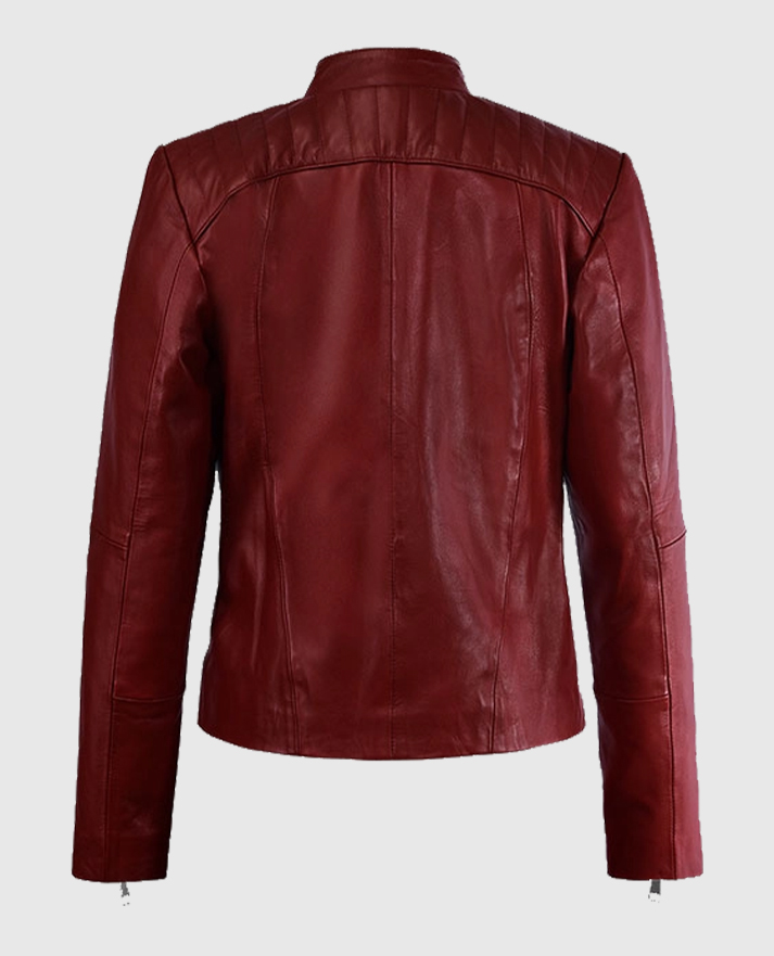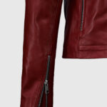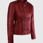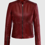 Unleash your inner action heroine with this head-turning cherry red leather jacket, inspired by Kaya Scodelario’s fierce role as Claire Redfield in the 2021 action horror film Resident Evil: Welcome to Raccoon City. Crafted from pure sheepskin leather and lined with soft viscose. The clean front zipper, stand-up collar, and quilted shoulders, while zippered cuffs and dual waist pockets bring just the right dose of utility. Pair it with black skinny jeans, a fitted tank or tee, and combat boots for a badass, action-ready look.