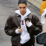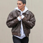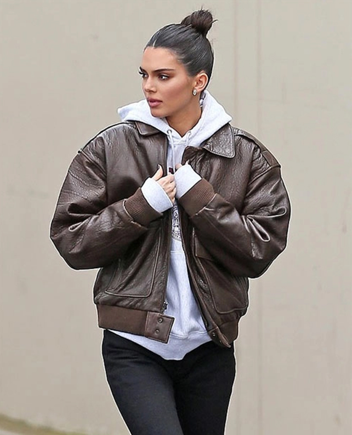 Own the street like a runway with this effortlessly chic brown leather bomber, inspired by Kendall Jenner’s off-duty style. Crafted from supple sheepskin leather and lined with soft viscose, this jacket offers both comfort and casual polish. The shirt-style collar, shoulder epaulets, and oversized flap pockets give it a utility edge, while rib-knit cuffs and hem keep the silhouette snug and stylish. Perfect for coffee runs, airport looks, fall layering, or any time you want that minimalist fashion model energy with a touch of vintage aviation cool.
