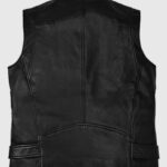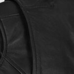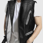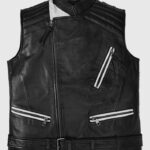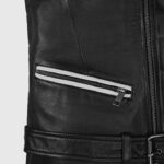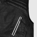 Make a bold statement with this classic black belted biker-style vest, crafted from premium sheepskin leather with a soft polyester lining for unmatched comfort. It features an asymmetrical zipper closure, a stand-up collar, and a belted waist for a sleek, structured fit. The contrasting white accents on the zippers and chest pocket add striking detail, making this vest stand out. Whether hitting the road or elevating your casual look, this vest delivers rugged style with timeless appeal.
