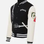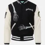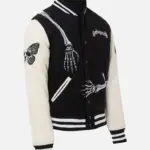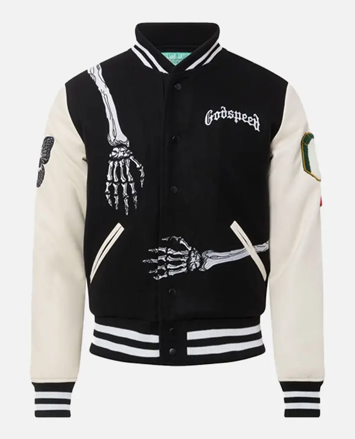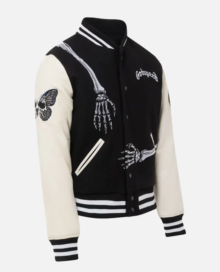 Gothic and Comfy Men’s Black & White Godspeed Skull Varsity Jacket