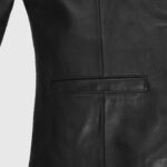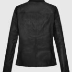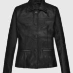 This black leather jacket reflects the cool look of Milla Jovovich while promoting her film Resident Evil at the planet Hollywood. Tailored from supple sheepskin leather with a soft viscose lining, it delivers structured elegance with a subtle edge. The button-front closure and shirt-style collar bring classic polish, while clean-cut waist pockets and rounded cuffs keep the design minimal and confident. You can layer it over a high-neck black top and trousers for sleek monochrome minimalism, or cinch it with a belt over a flowy midi dress for soft structure.