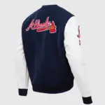 The MLB Atlanta Braves men’s blue varsity jacket at the Genuine Jacket Store ensures your elevated persona in the best possible manner. This fashion piece showcases allure with its combination of navy blue and white hues. The signature attire of the professional baseball team, Atlanta Braves, slays the game and fashion in the MLB. For this purpose, the exterior, including sleeves, features the delicate embellishment of the Atlanta Braves’s logos and wordmarks.