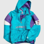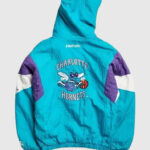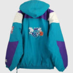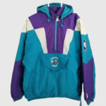The NBA Charlotte Hornets Starter jacket is a stylish homage to 90s basketball fashion. Made from a durable cotton-polyester blend with a soft viscose lining, it offers lightweight warmth and breathability. The pullover style includes a half-zipper closure, hooded collar, and elastic cuffs for a comfortable fit. The blue and purple color fusion makes it perfect for game days or casual wear while the front pouch pocket adds convenience. This charlotte hornets starter jacket pairs well with joggers and sneakers or denim and boots.