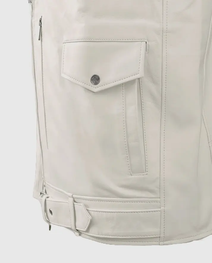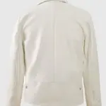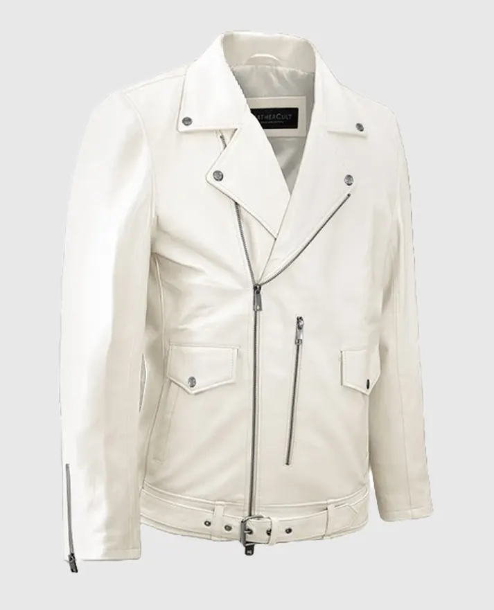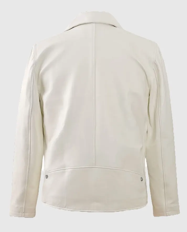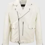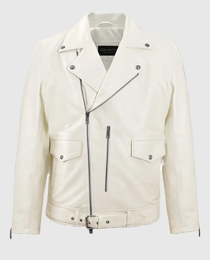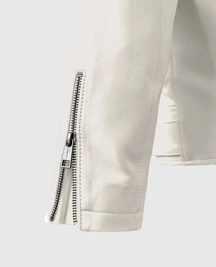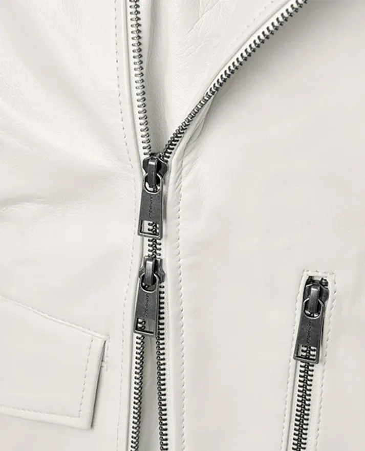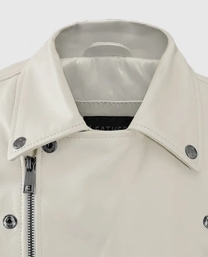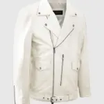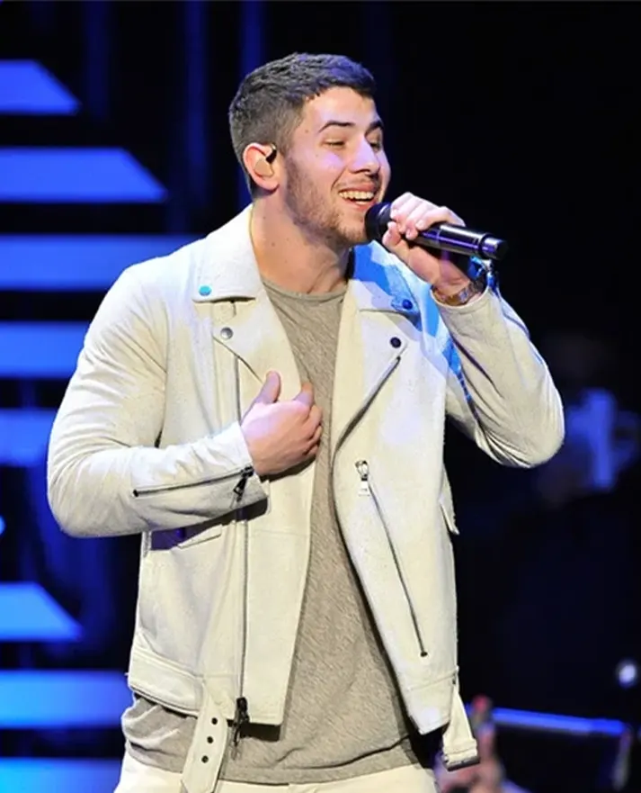 If You Are a True Lover of New Styles in Leather Jackets, Then You Must Try this drop-dead gorgeous white biker leather jacket inspired by charming celebrity Nick Jonas. Nick made a huge impact among his fans while performing onstage at Wild 94.9’s FM’s Jingle Ball, presented by Capital One at SAP Center. Crafted from premium sheepskin leather and a soft viscose lining, this jacket offers both durability and comfort. The asymmetrical zipper closure and lapel collar give it a classic biker aesthetic, while the full-length sleeves with zipper cuffs add an edgy touch. Designed in a striking white color, it features multiple pockets for both function and style.