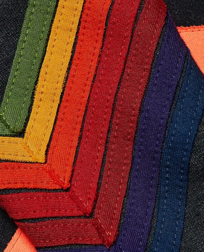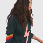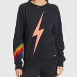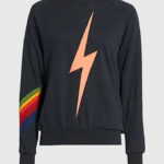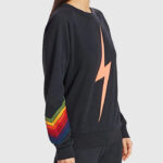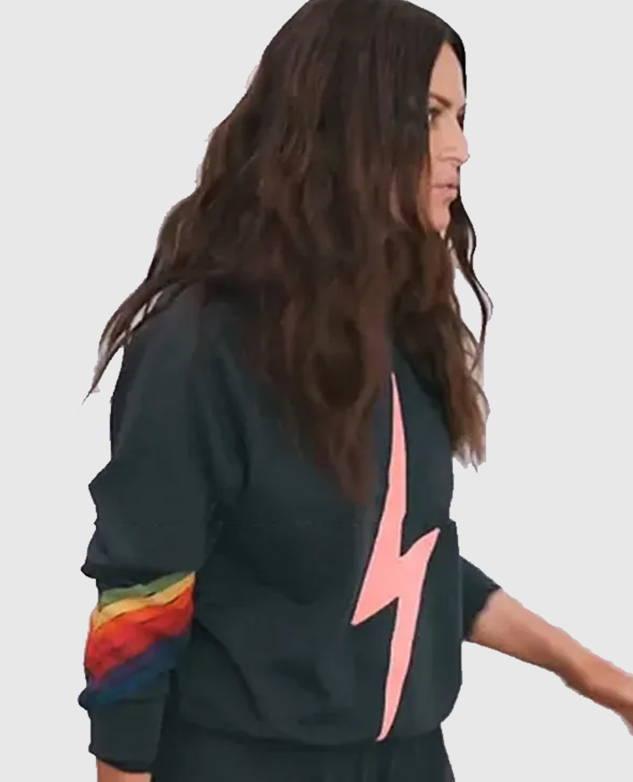 Get the bold and stylish look of Lisa Barlow from the American reality television series The Real Housewives of Salt Lake City with this lightning bolt sweatshirt. Made from premium fleece fabric, this cozy pullover offers ultimate comfort and warmth. It features a round collar, full sleeves, and rib-knitted cuffs and hemline. The striking pink lightning bolt design on the front and the rainbow stripe detail on the sleeve add a vibrant, edgy touch. Available in black/navy, this sweatshirt is perfect for casual outings or lounging in style.