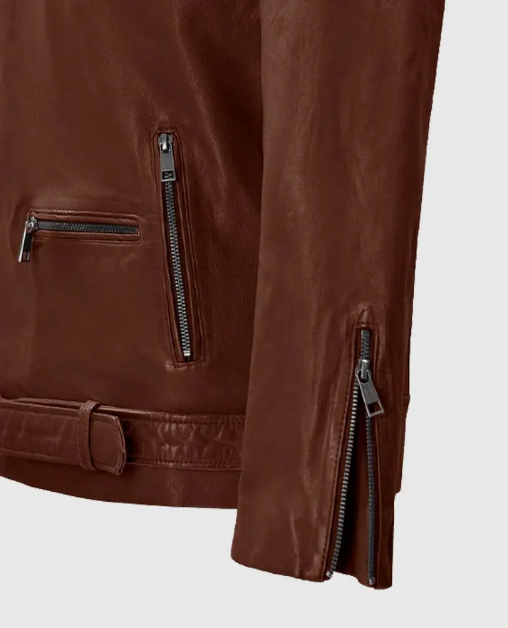The rutland riding leather jacket is a timeless blend of rugged charm and modern sophistication, crafted from sheepskin leather with a smooth viscose lining for comfort. Its asymmetrical zipper closure, and zipper cuffs give it a bold, biker-inspired look, while the adjustable waist belt ensures a tailored fit. The tan brown hue adds a warm, vintage touch. You can pair it with black skinny jeans and ankle boots for an edgy vibe or go classic with a white tee, blue denim, and Chelsea boots for effortless cool.
