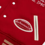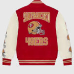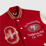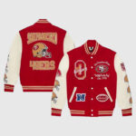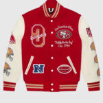 The San Francisco 49ers varsity jacket seamlessly blends NFL team spirit with OVO’s streetwear style, making it a must-have for football fans. It is crafted from high-quality wool and features sleek leather sleeves, ensuring both warmth and durability. The jacket includes a rib-knit collar, cuffs, and hem, along with multiple pockets for added practicality. The 49ers jacket with super bowl patches making it perfect for game days and casual outings. You can pair it with jeans and sneakers for a sporty look or layer it over a hoodie for extra warmth in colder weather.