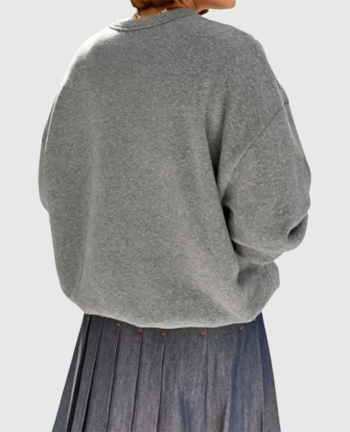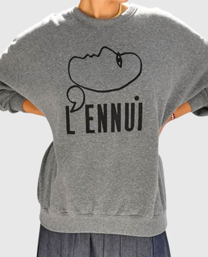 Elevate your casual style with this grey oversized l’ennui sweatshirt, inspired by Christa Miller’s effortlessly chic look in the American comedy-drama television series Shrinking Season 2 as Liz. We made this sweatshirt with fleece fabric to offer superior comfort and warmth. The pullover design, round-neck collar, and full-length sleeves with rib-knitted cuffs ensure a relaxed yet stylish fit. Its versatile gray color makes it an easy wardrobe staple, perfect for layering or lounging in style.