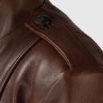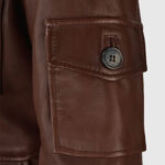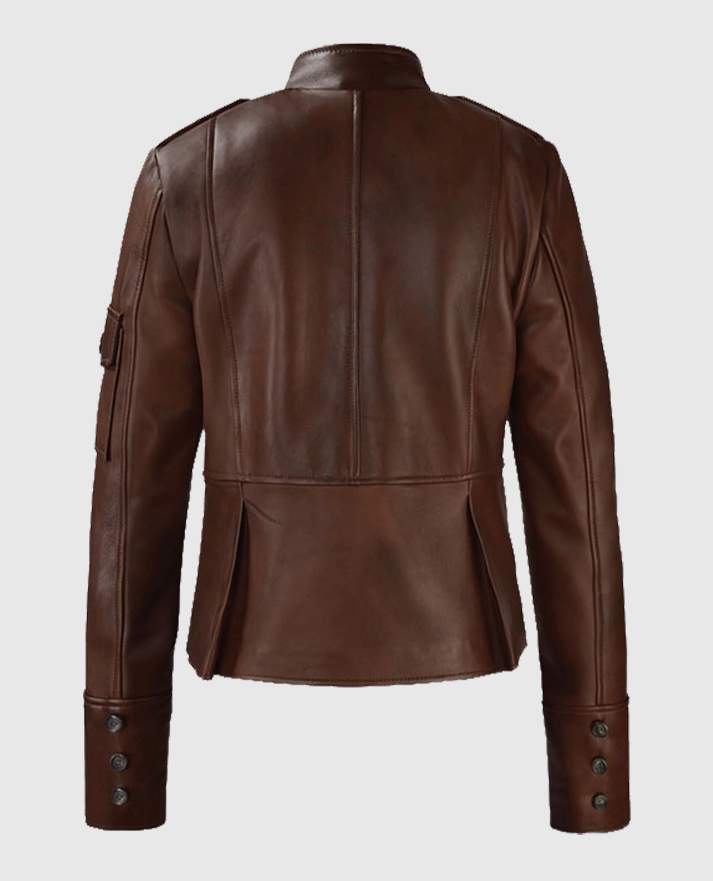 Infuse your outerwear collection with rugged elegance in this Spanish brown leather jacket, inspired by Katherine Heigl street style look. Crafted from premium sheepskin leather and backed with a soft viscose lining. The jacket features a stand-up collar and button-down front that channel a distinct military aesthetic, while the full-length sleeves and buttoned round cuffs offer a tailored finish. It includes four spacious flap pockets on the front and an additional utility pocket on the sleeve. Perfect for adding a touch of polished edge to casual and smart-casual ensembles alike.