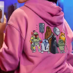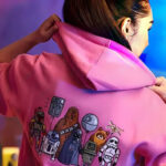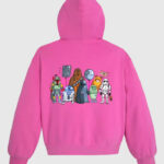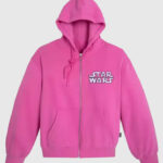 This Star Wars Pink Hoodie is a vibrant and playful tribute to the legendary sci-fi franchise and draws inspiration from the Star Wars universe. Made from cozy fleece fabric, it features a zip-up front, a hooded collar with string, and rib-knitted cuffs with a pouch pocket. The back of the hoodie showcases a cartoon-style illustration of iconic Star Wars characters. While the front has a cool Star Wars logo. This pink Star Wars zip up is a must-have for fans who love a fun and casual take on their favorite characters.