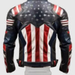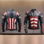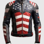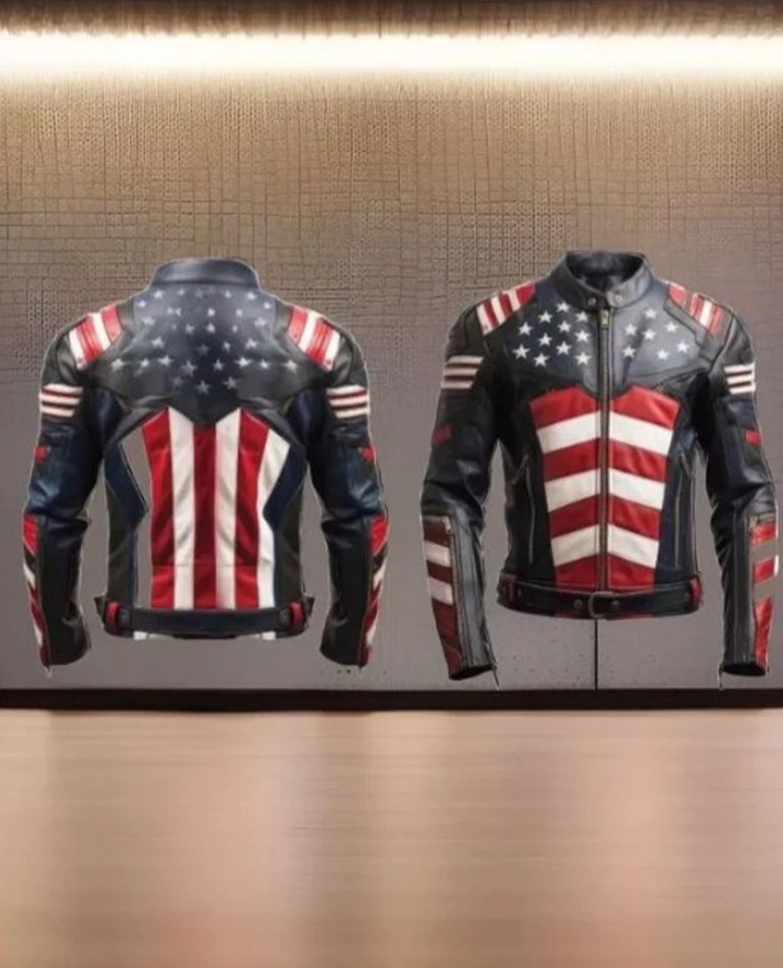 Show off your patriotic spirit with the U.S American Flag Leather Jacket. The striking blue base color is accented with American flag-inspired detailing, featuring white stars on the chest and bold red and white horizontal stripes on the sleeves. Crafted from genuine leather and soft viscose lining to ensure a cozy feel. While the stand-up style collar and front zipper closure add a modern edge. This jacket features full-length sleeves with zipper cuffs, along with padded shoulders and upper arms. Stitched panel detailing enhances its structure, while two outer zipper pockets provide practicality. This jacket is the perfect fusion of patriotism and fashion.