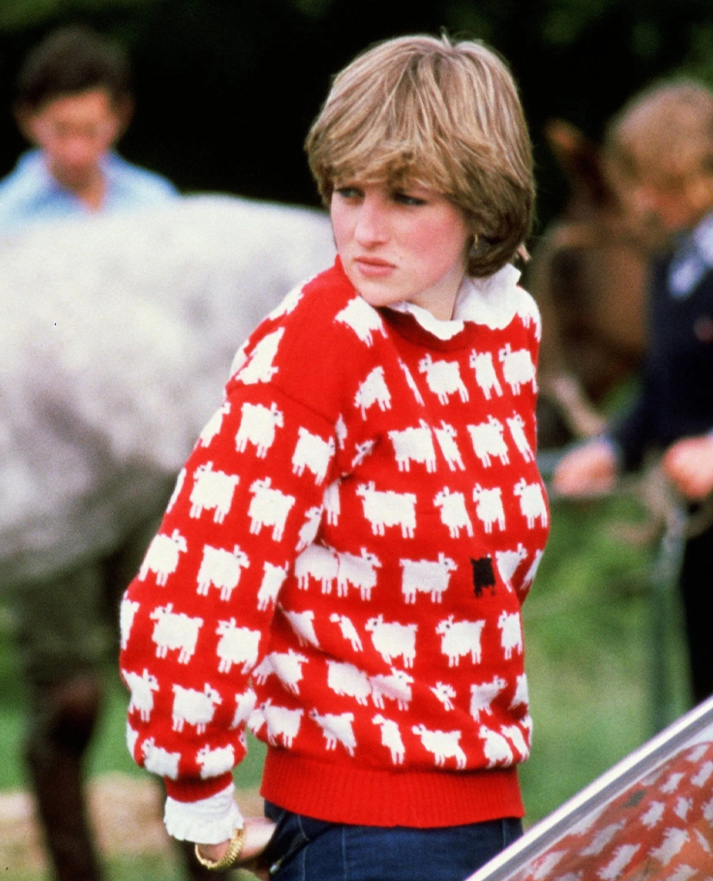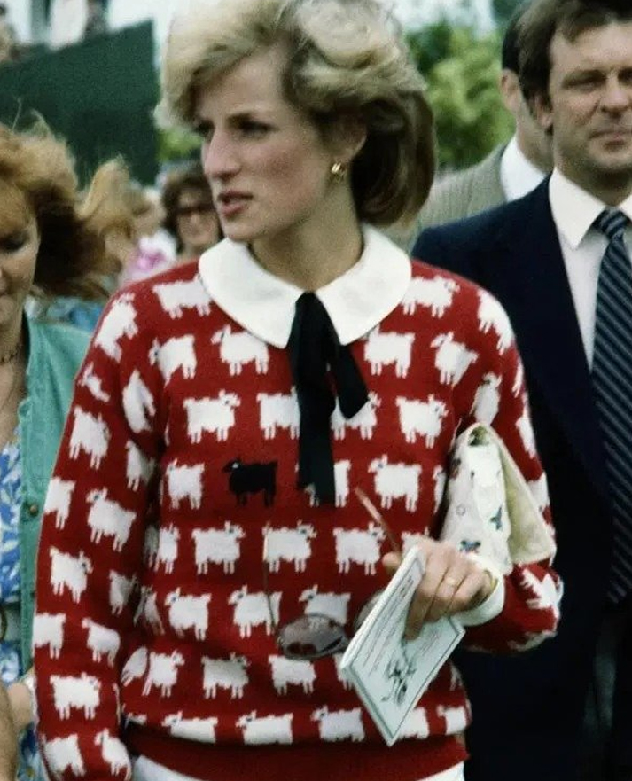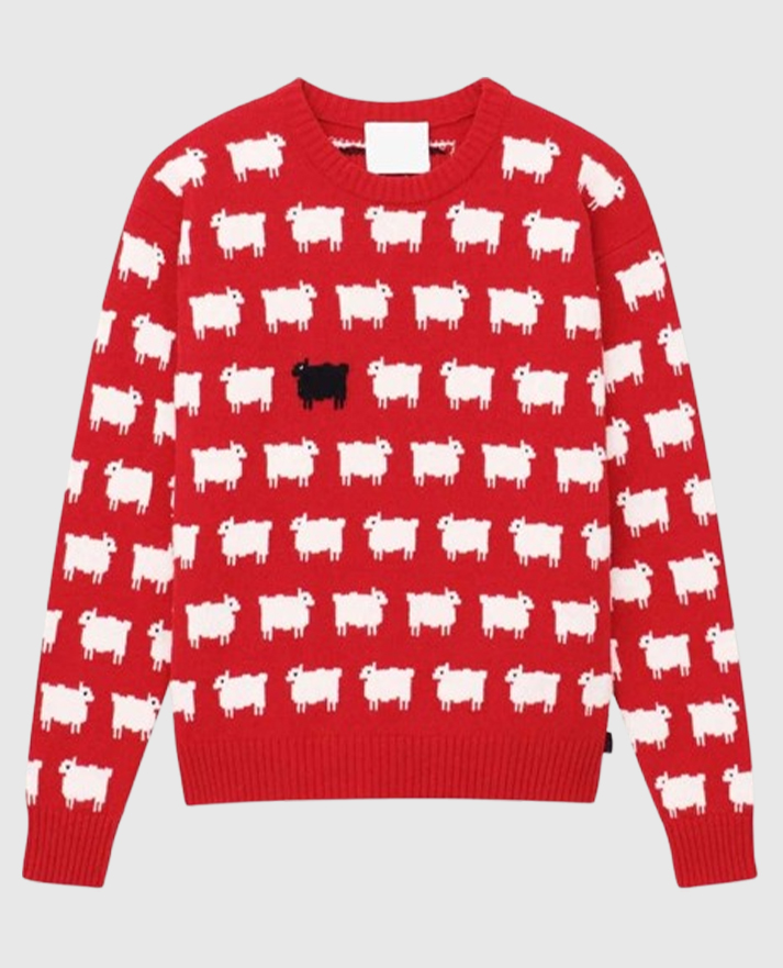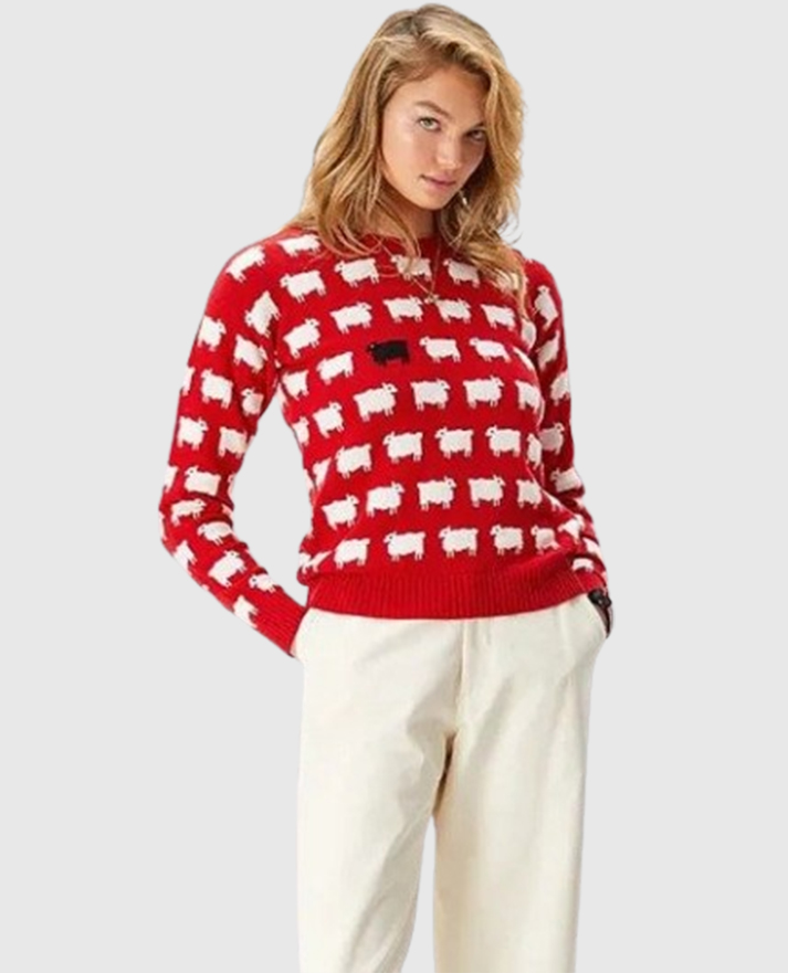 Embrace royal-inspired fashion with black sheep sweater worn by Princess Diana. Comes in a charming pullover design and is made with knitting fabric for comfort and durability. Its crew-neck collar, full-length sleeves, rib-knitted cuffs, and hemline create a cozy fit, while the vibrant red and black sheep patterns add a cute flair. Pair women’s black sheep sweater with high-waisted jeans or over a pleated skirt with a matching knitted cap and make a stylish look for holiday gatherings, cozy winter outings.