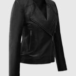 Asymmetrical Black Collarless Leather Biker Jacket for Women