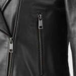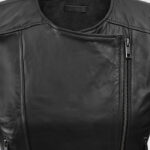 The sleek and minimal Women’s Black Collarless Leather Biker Jacket with Asymmetrical zip design is the definition of modern elegance with a rebellious edge. Crafted from premium sheepskin leather and lined with soft viscose lining. This jacket delivers a smooth and flattering fit with unmatched comfort. The asymmetrical front zipper and clean round neck design bring a contemporary twist to the classic biker style. Full-length sleeves and zipped waist pockets add practicality without compromising on style. Ideal for casual hangouts, office outings, date nights, or urban adventures where you want to stay stylish and confident.