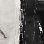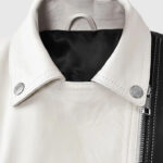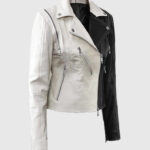 The Moto Twister Leather Jacket for women is a bold statement piece crafted from genuine sheepskin leather, featuring a striking black and off-white color block design. Its asymmetrical front zipper and wide notch lapel collar add a rebellious edge, while the long sleeves with zippered cuffs enhance its sleek, tailored fit. The standout feature of this is its zipper design on the shoulders running towards the back. It includes three external zippered pockets for practicality. The soft viscose lining ensures all-day comfort, making this jacket a standout choice for those who want to combine classic moto style with a modern twist.